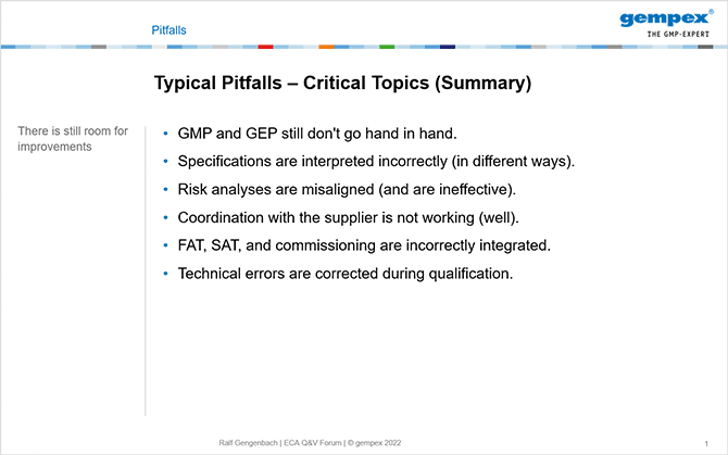 - Die Einbindung des Engineerings (Good Engineering Practice; GEP) in die Geräte-Qualifizierung (GMP) fehlt häufig noch oder ist noch nicht so umfänglich wie möglich umgesetzt