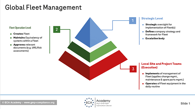 Was verbirgt sich nun hinter einer "Fleet". Es ist eine Gruppe äquivalenter Systeme in Konstruktion und Installation anhand der gleichen Spezifikationen über viele Herstell-Räumlichkeiten und Standorte hinweg. Gesteuert über ein zentrales pharmazeutisches Qualitätssystem über den gesamten Lebenszyklus der Ausrüstung. Äquivalenz bedeutet, dass Herstell-Systeme bei kritischen Aspekten (Spezifikationen, Design, Funktionen, Betrieb, Qualifizierung) identisch in Bezug auf den cGMP-Einsatz verbleiben. Die Betrachtung von Äquivalenz umfasst viele Aspekte: