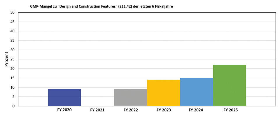 Der Blick auf GMP-Mängel bei gebäudetechnischen Gegebenheiten, wie sie in den Warning Letters der letzten 6 Fiskaljahre beschrieben werden, lässt einen interessanten Trend nach oben erkennen. In 22% der Fälle fanden die Inspektoren hier nicht GMP-konforme Produktionseinrichtungen, die nicht den Vorgaben des Paragrafen 211.42 Design and Construction Features entsprachen. Diese Mängel fanden die GMP-Inspektoren überwiegend in Standorten, in denen aseptisch gefertigte Arzneimittel hergestellt wurden.