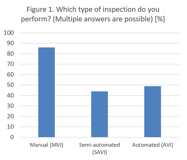 Die manuelle visuelle Kontrolle (MVI) ist bei 86 % der Befragten nach wie vor die am häufigsten eingesetzte Methode, während 44 % halbautomatische Verfahren (SAVI) und 49 % Vollautomaten (AVI) einsetzen. Dies spiegelt einen vielfältigen Technologiemix wider, zeigt aber auch, dass die manuelle Kontrolle weiterhin als regulatorische Referenzmethode gilt, die auch bei Verwendung eines vollautomatischen Systems erforderlich ist.