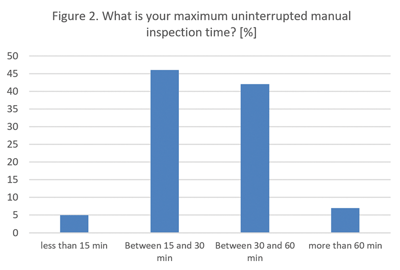 Die Arbeitsbedingungen bei der manuellen Inspektion deckten sich ebenfalls mit den GMP-Anforderungen. Die meisten Unternehmen gaben an, dass die Kontrollen ohne Unterbrechung zwischen 15 und 30 Minuten (46 %) oder zwischen 30 und 60 Minuten (42 %) dauerten, gefolgt von festen Pausen. Diese Werte entsprechen der Intention von Annex 1 (8.31), der häufige Ruhepausen zur Vermeidung von Ermüdung fordert, und den Empfehlungen der USP <1790> zu Ergonomie und Leistungsfähigkeit der Anwender.