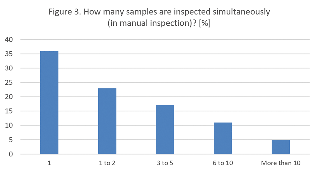 Auf die Frage, wie viele Objekte gleichzeitig geprüft werden, gab mehr als die Hälfte der Befragten (59 %) an, dass sie 1-2 Objekte zulassen, was auch der bewährten Praxis entspricht. In den Arzneibüchern gibt es jedoch keine Begrenzung für die Anzahl der Proben, die gleichzeitig geprüft werden dürfen. AQL-Daten können verwendet werden, um die gleichzeitige Inspektion von mehr als zwei Proben zu rechtfertigen. Der Vorteil der gleichzeitigen Prüfung mehrerer Behälter besteht darin, dass Über- oder Unterfüllungen leicht zu erkennen sind.
