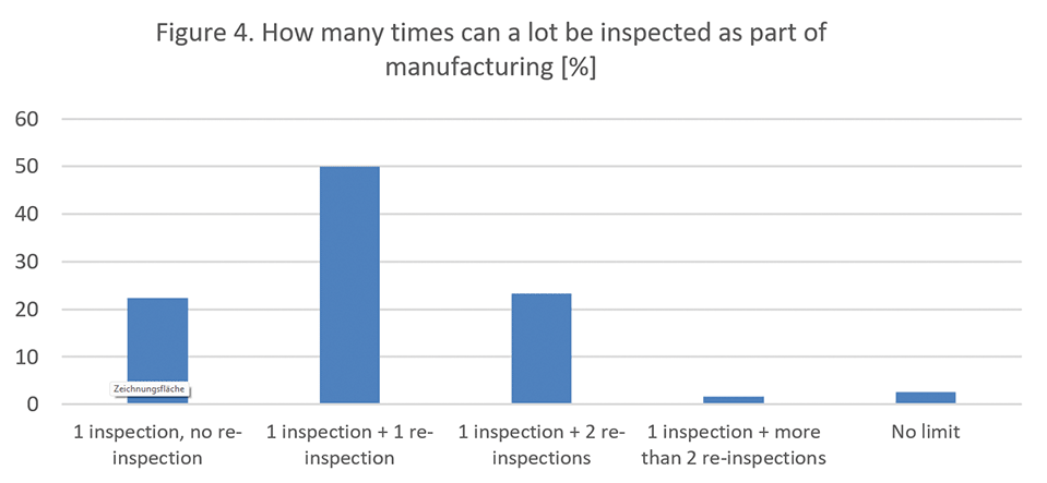 Die Mehrheit der Unternehmen hat auch klare Obergrenzen für die Anzahl der visuellen Kontrollen pro Charge im Rahmen der Fertigung festgelegt. Auf die Frage "Wie oft kann eine Charge im Rahmen der Herstellung zu 100 % geprüft werden?" geben 22 % an, dass nur eine einzige Prüfung ohne Nachprüfung zulässig ist, 50 % erlauben eine Nachprüfung, 23 % zwei Nachprüfungen, 2 % mehr als zwei und 3 % geben an, dass es keine festgelegte Obergrenze gibt. Diese Zahlen sind sehr interessant. Keine Nachprüfungen zuzulassen (22 %) ist sehr strikt. 73 % lassen eine oder zwei Nachprüfungen während der Fertigung zu, was den aktuellen Vorgaben entspricht (die FDA neigt dazu, nur eine Nachprüfung zuzulassen). Allerdings lassen 5 % mehr als zwei Nachprüfungen zu oder haben überhaupt keine Beschränkung für die Anzahl der 100 % visuellen Kontrollen. Dies könnte damit begründet werden, dass die visuelle Kontrolle nicht als Test, sondern als reiner Fertigungsschritt betrachtet wird. Wenn jedoch regelmäßig eine hohe Anzahl von Nachprüfungen durchgeführt wird, müssen bei einer GMP-Inspektion wahrscheinlich Fragen zur Validität der vorangegangenen Herstellschritte beantwortet werden.